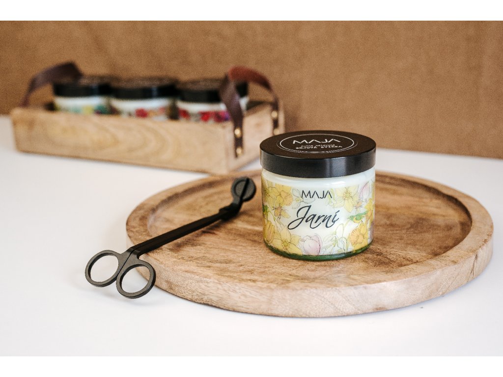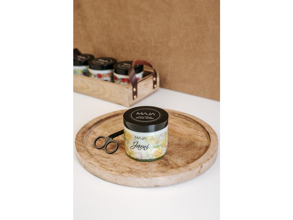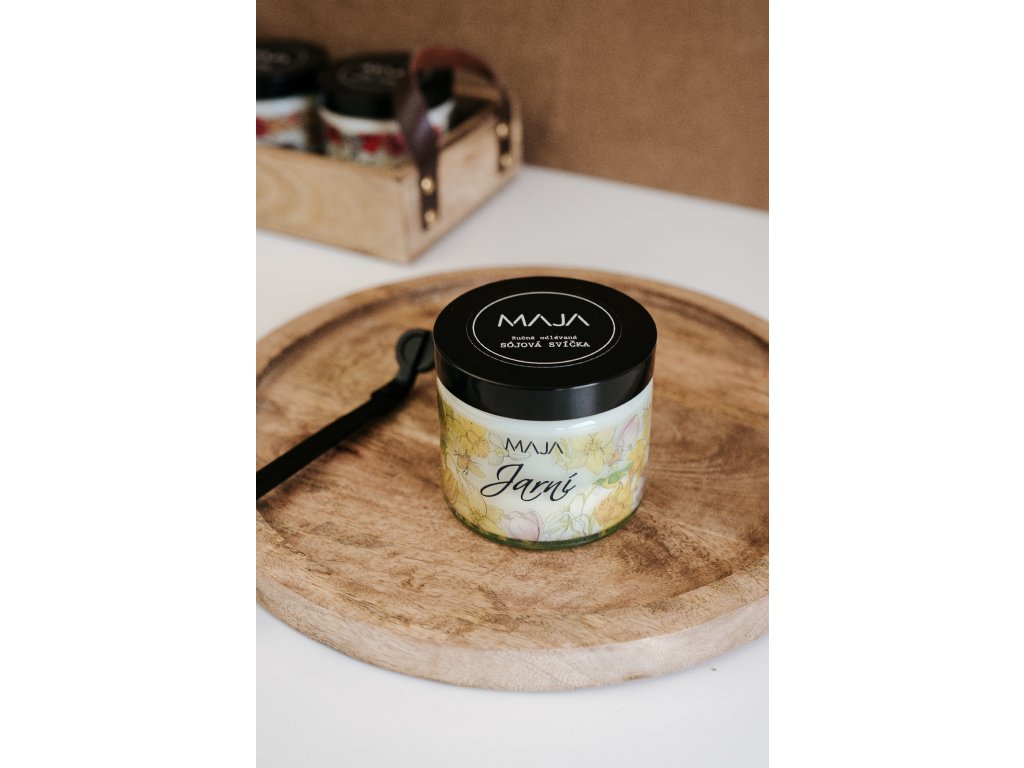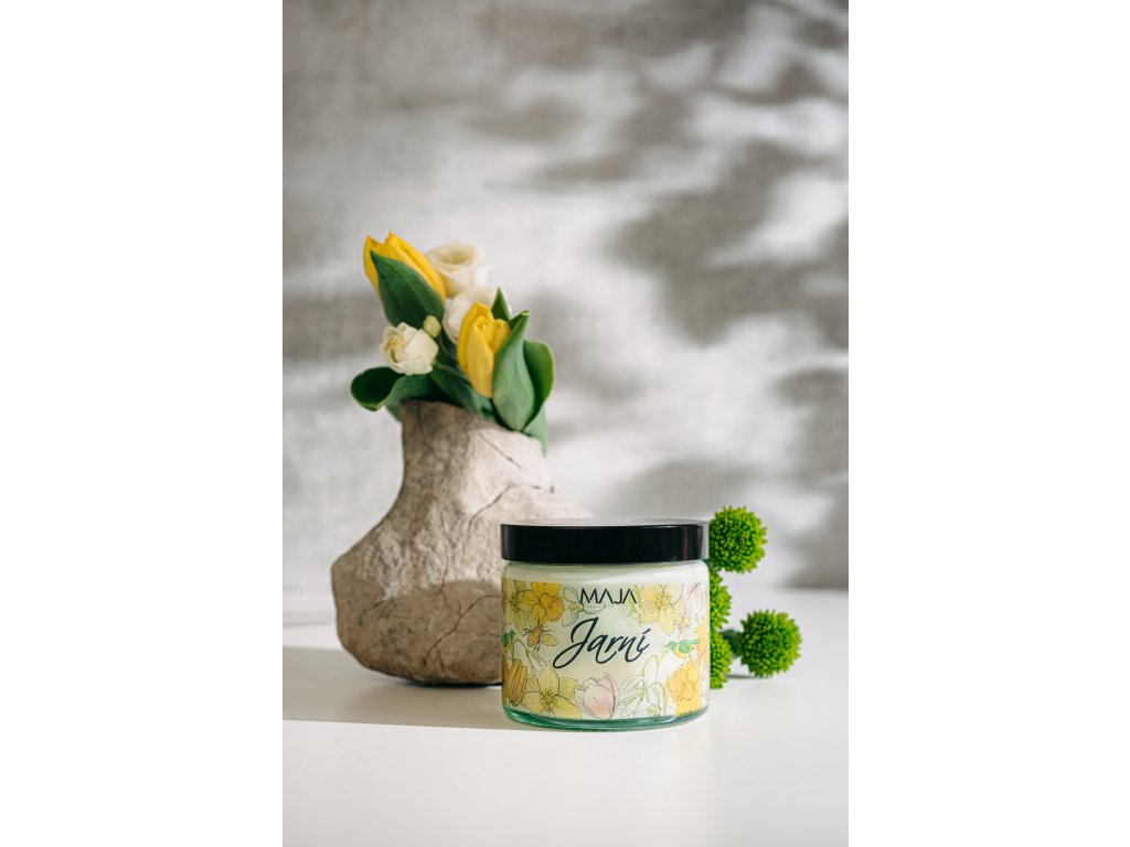 Přivítejte jaro s naší sójovou svíčkou Jarní z nové kolekce inspirované přirodou. Svíčku zdobí ručně malovaná transparentní autorská etiketa, která při hoření svíčky krásně vynikne. Je inovativním doplňkem do jarní dekorace vašeho domova. Vůně je svěží a vznikla spojením květin a citrusů.